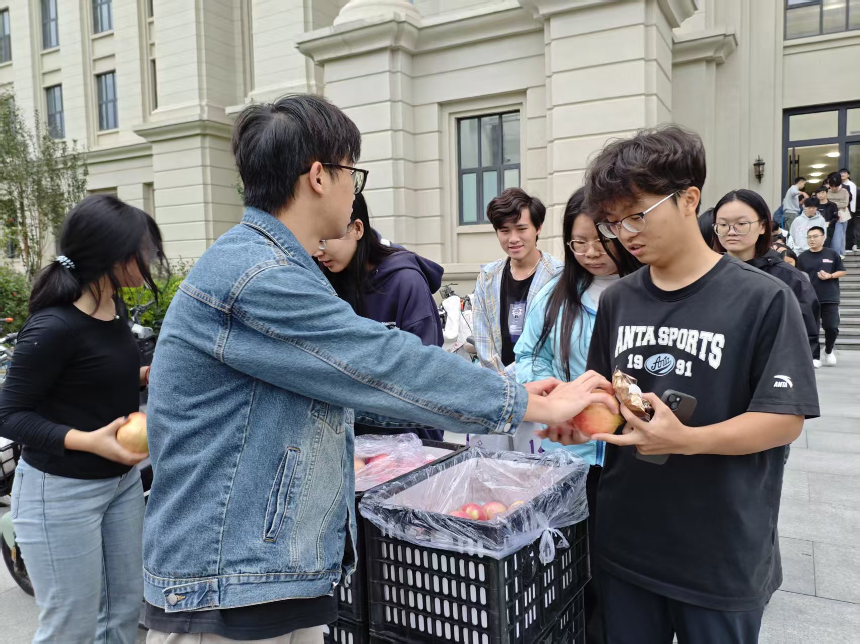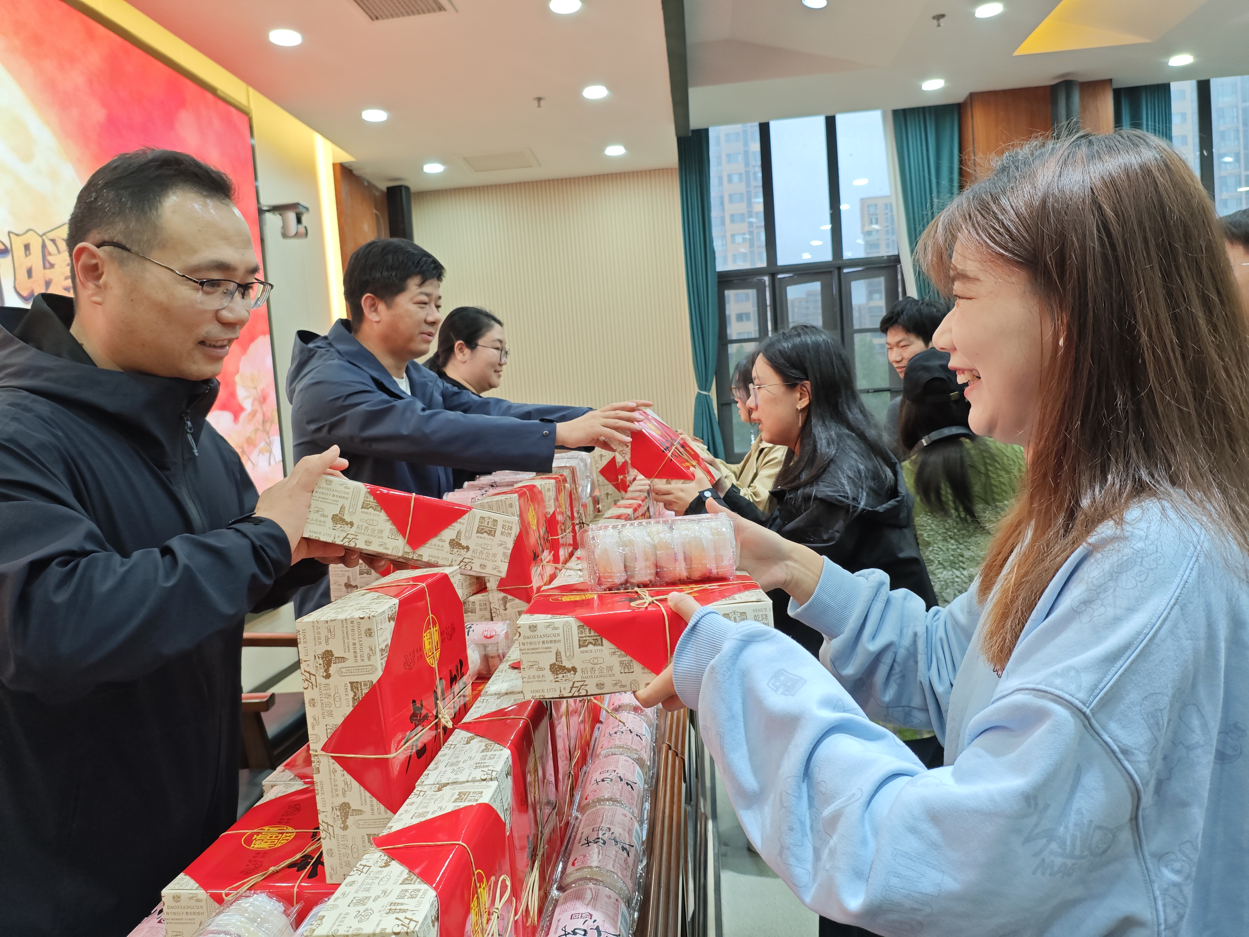 活动现场暖意融融,师生欢聚一堂共话中秋。老师们带领工作人员将准备就绪的物资逐一分发到每位学生手中:包装精巧的月饼藏着传统节日的团圆滋味,色泽鲜亮的苹果承载平安顺遂的美好期许,颗粒饱满的石榴象征多福多喜的吉祥寓意,每一份物品都满含学院对学子的牵挂。