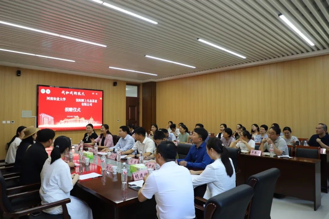 在信阳潭上生态茶业有限公司捐赠仪式上,郭战伟首先代表学校对李亚磊校友一行和各位校友荣归母校表示热烈欢迎和衷心感谢,并简要介绍了学校的最新发展成就。他高度赞扬了李亚磊校友心系乡土、投身乡村振兴的善举,指出其行动与我校“明德自强,求是力行”的育人理念高度契合。郭战伟强调,此次捐赠必将激励更多学子关注茶产业,为服务乡村振兴与产业升级贡献智慧和力量。李亚磊校友深情回顾了母校对其创业征程的坚实支持,表示躬耕田园、根植中原正是对母校精神的践行,作为农大人,响应国家号召、助力河南茶产业焕发新光是应有的担当。随后,郭战伟代表学校接受捐赠,并向李亚磊颁发捐赠证书及纪念校徽。