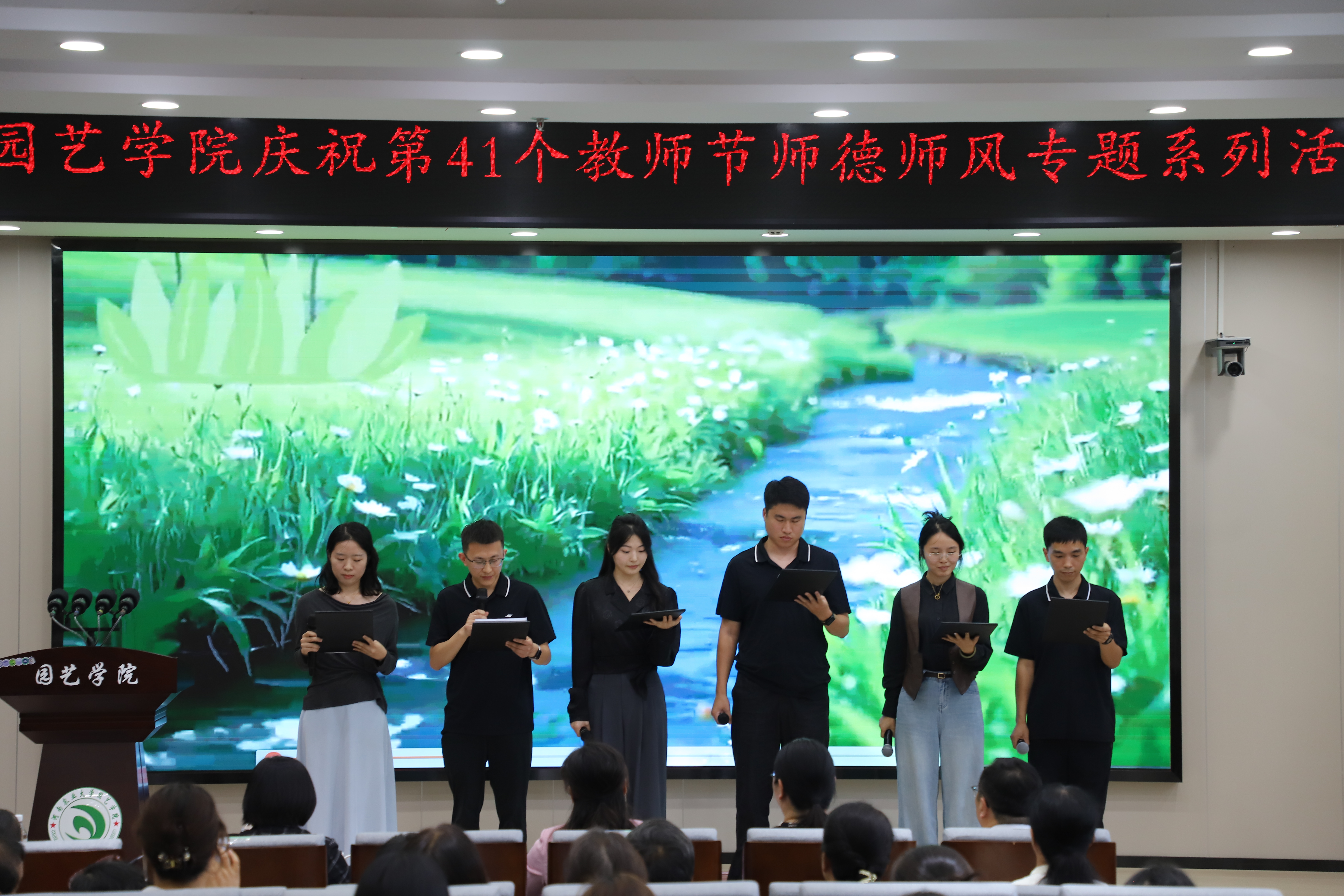 紧接着,新进青年教师代表丛柳上台发言。他分享了自己选择投身园艺教育事业的初心,表达了对学院前辈教师的敬佩之情,并承诺将以荣休教师为榜样,牢记教育使命,不断提升教学与科研能力,尽快融入学院大家庭,为园艺学科的发展贡献青春力量。发言结束后,6位新进青年教师共同朗诵诗歌《师者之光》,铿锵有力的字句中,传递出新一代教育工作者对“师者”身份的理解与坚守;随后,全体新进青年教师又合唱歌曲《和你一样》,悠扬的旋律里,展现了青年教师们团结奋进、携手同行的精神风貌,现场气氛再度推向高潮。