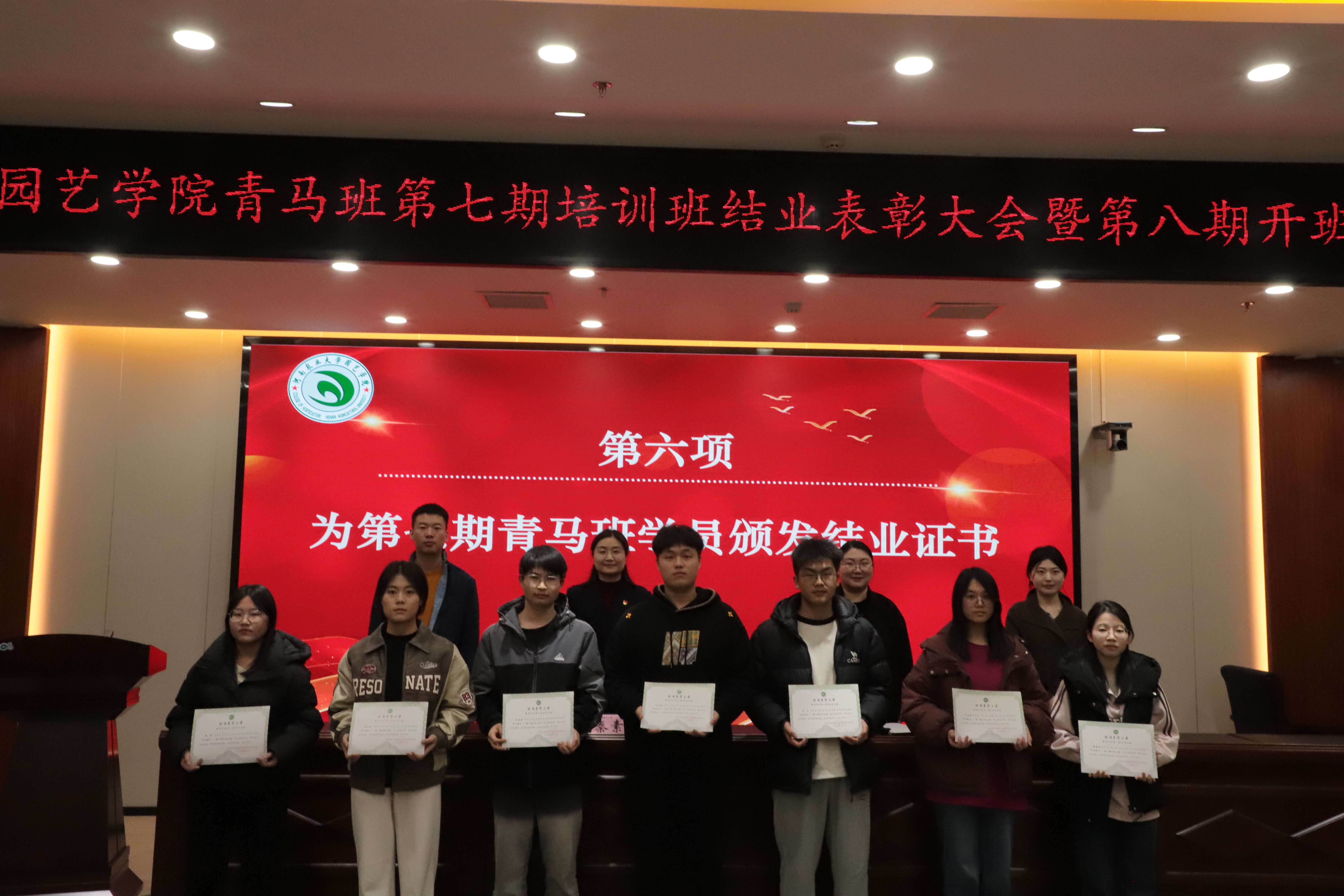 会议在激昂的《国际歌》声中拉开帷幕。参会人员一同观看第七期青马培训班纪念视频,回顾第七期学员的成长历程。随后,丁坤和何静分别宣读第七期青马班结业名单与优秀学员表彰决定,并为第七期优秀学员颁发荣誉证书、为学员代表颁发结业证书。