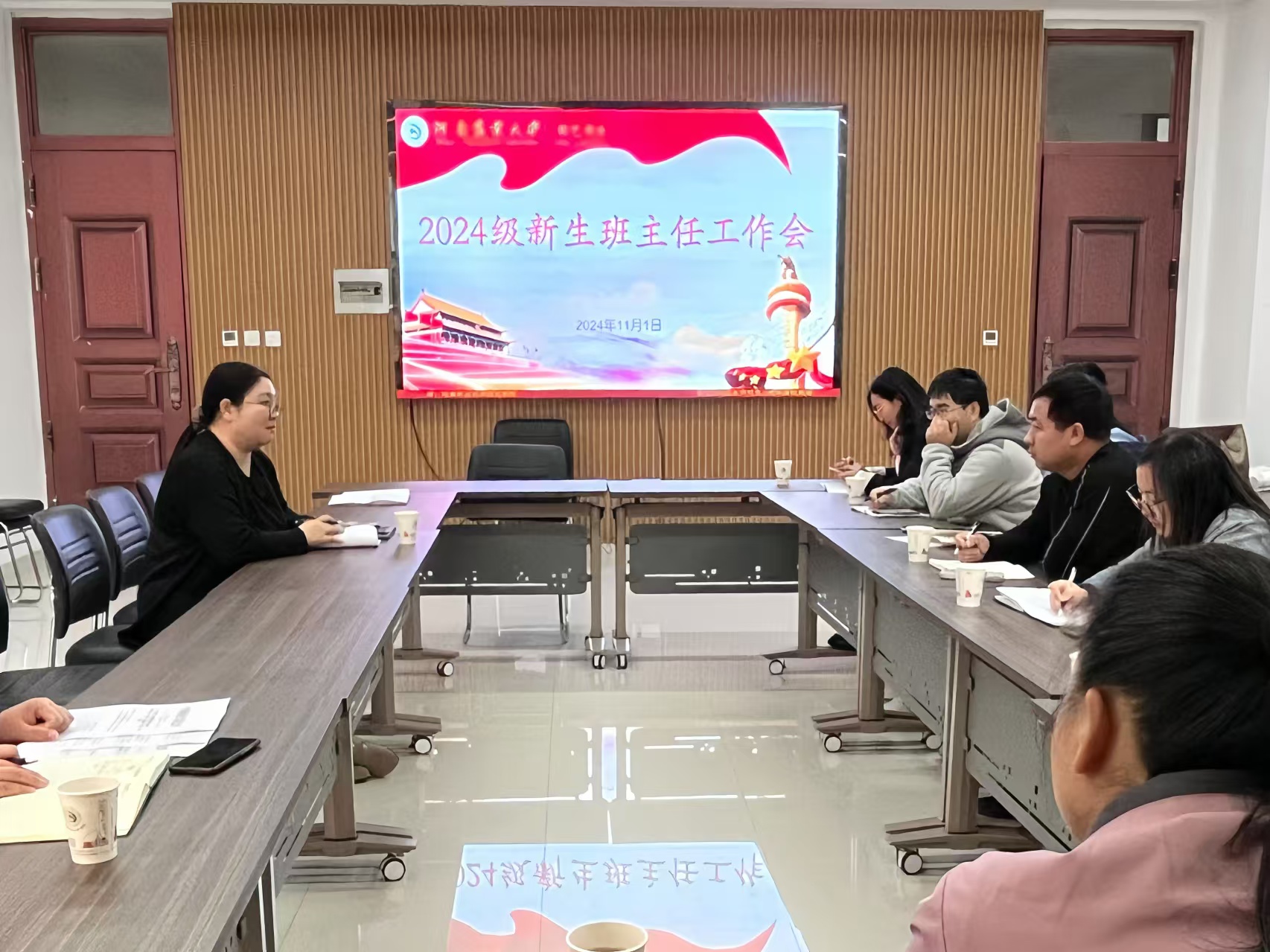 在力行楼211会议室召开了2024级新生班主任工作会。学院党委书记秦素玲、党委副书记余果、团委书记冯帅、2024级辅导员何静及全体新生班主任参加会议,会议由余果主持。