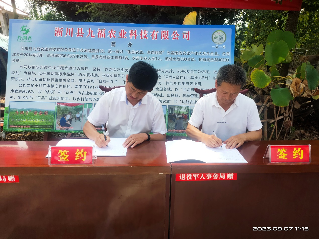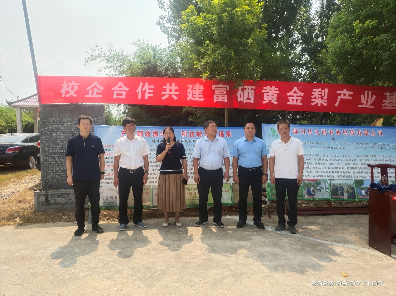 与九福农业签署了淅川富硒梨产业基地共建协议。最后,在大家的见证下,双方共同为基地揭牌。