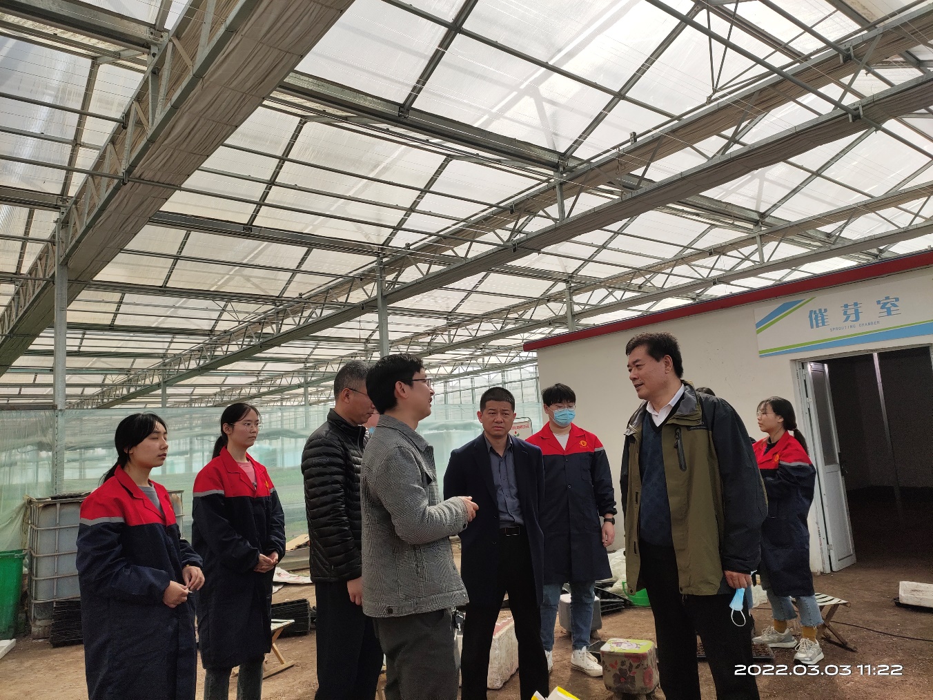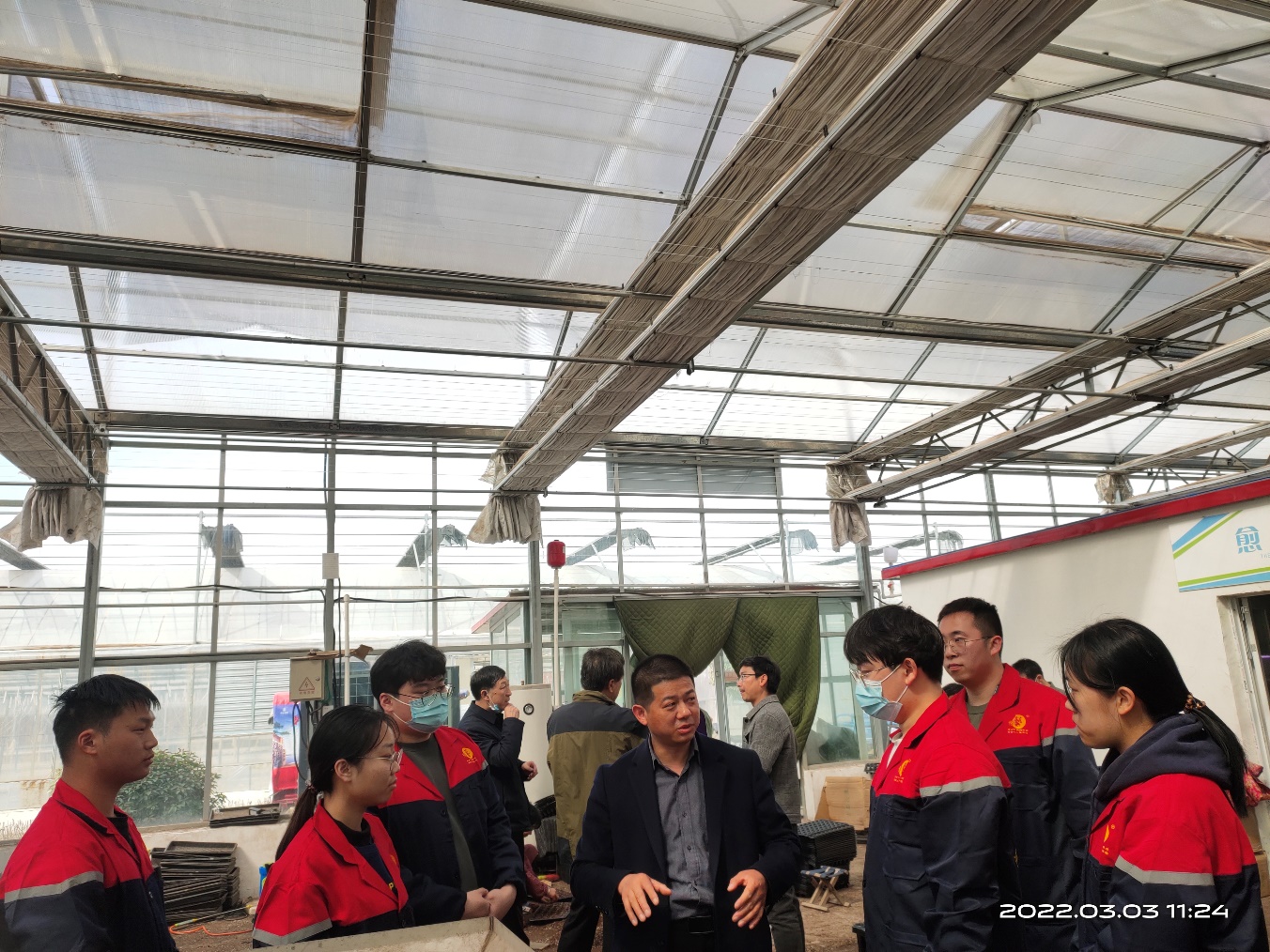 3月3日上午,色漫天堂 党委副书记李成吾、校工会执行副主席闫耀礼、工会办公室主任赵亚芳等一行,来到河南农大扶沟蔬菜研究院考察调研,并看望正在这里学习的色漫天堂 实习生,色漫天堂 副院长郑先波陪同调研。