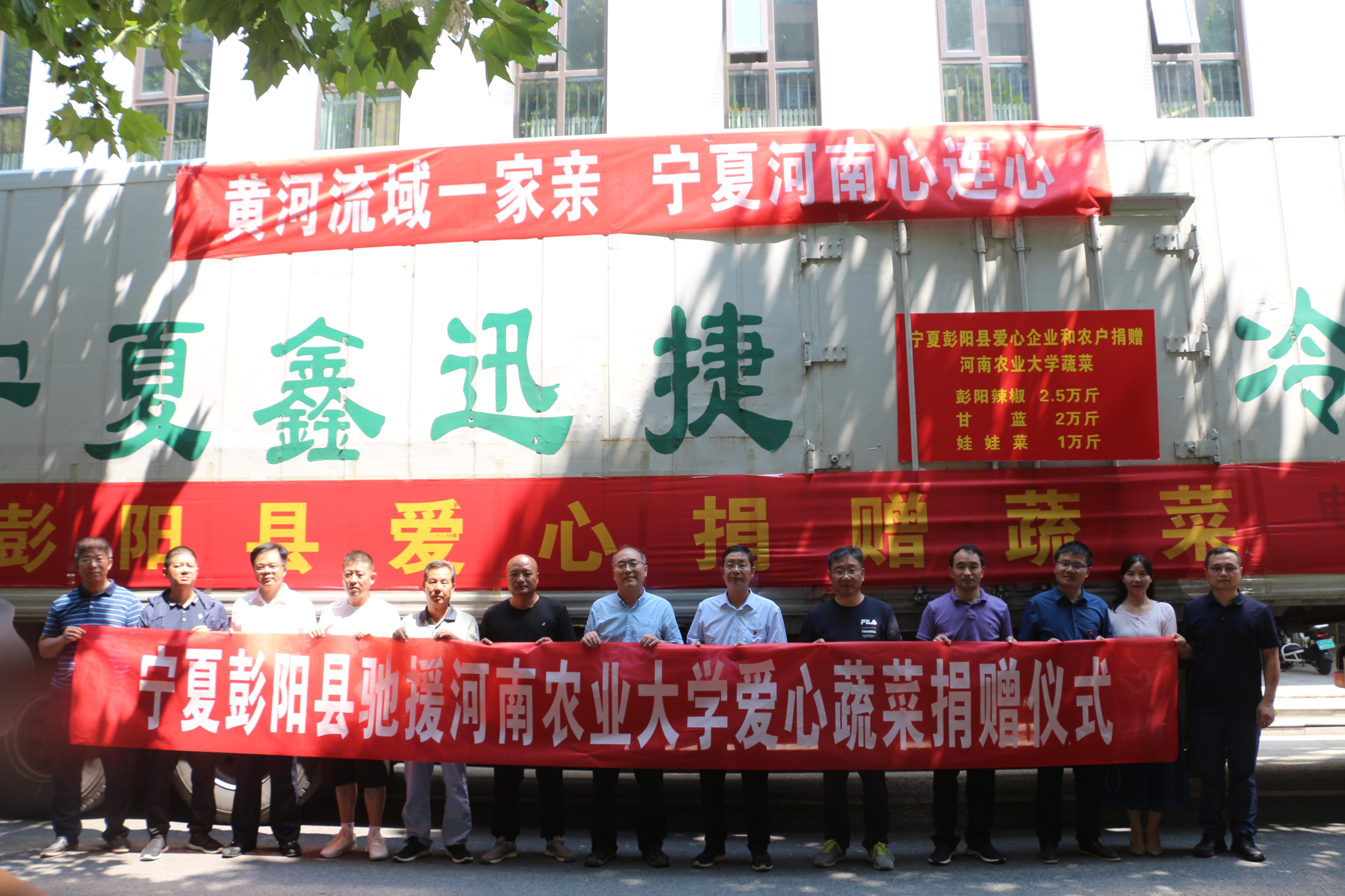 郑州遭遇强降雨后,宁夏彭阳县农业农村局积极号召当地企业、合作社和农户伸出援手,向我校捐赠爱心蔬菜,帮助学校师生共渡难关。此次捐赠共收到宁夏彭阳县守国农业发展有限公司甘蓝20000斤,东升有机种植有限公司娃娃菜10000斤,彭阳爱彬种植专业合作社辣椒10000斤,彭阳县正军果蔬种植合作社青尖椒5000斤,以及彭阳县古城镇郑庄村和田庄村23位农户捐赠辣椒10000斤,共计蔬菜55000斤。