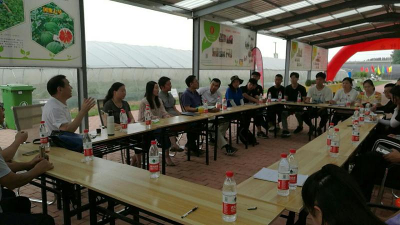 (扶沟)蔬菜研究院看望了实习生,并进行了面对面谈话。实习生们分别对自己的实习情况进行了汇报,并和自己的指导老师针对毕业论文设计进行讨论,最后孙守如、马长生和胡建斌教授分别进行了总结,并针对出现的问题提出了相应的建议。接着,支部成员观摩了研究院展示的蔬菜新优品种。先是参观了新选育的番茄和辣椒品种,小小的茎枝上挂着密密麻麻的番茄、辣椒,不但品质优良,而且产量非常高,不断给人以视觉冲击。例如 “卷珠帘”、“巧克力”、“芒果”等番茄新品种,“西北旅一尺长”、“大象螺丝椒”、“G细线椒”、“椒之玉”等辣椒新品种,形态各异,品质俱佳。紧接着,仔细参观了各种西瓜和甜瓜品种,最吸引眼球的属“彩虹瓜之宝”西瓜,其瓤色红橙、乳黄相间、犹如彩虹,入口即化的特点让人流连忘返、回味无穷。此外,“黄金三号”(黄皮红肉)西瓜品种和“豫甜脆又脆”、“金凤凰”等甜瓜品种各具特色。