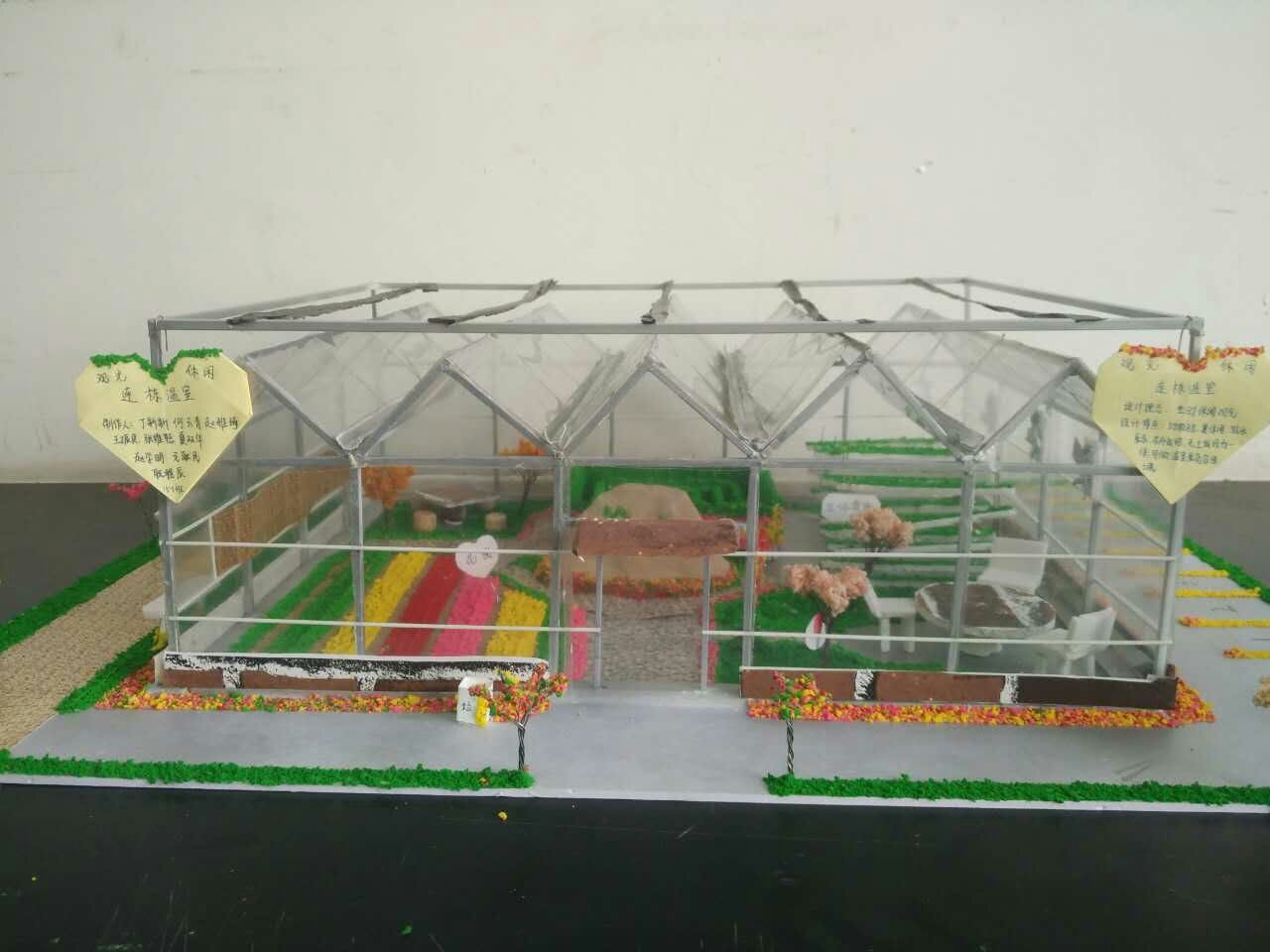 在模型制作过程中,各个小组按比例制作,以课堂所学的理论知识为指导,力求还原真实温室的结构和真实情境。制作的日光温室模型结构参数合理,采光效率高、保温和通风措施周全,高跨比、保温比适当。制作的连栋温室模型比例适当、结构合理,传力路径明确,设施设备配置齐全。制作的伊甸园温室模型,模拟采用先进的膜结构技术,在废旧的矿区建设ETFE充气薄膜温室,温室内设置多个植物栽培区,环保理念突出,是改造废弃地块、发展观光旅游的好项目。