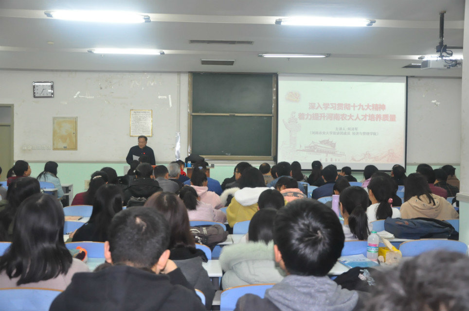宣讲团成员、经济与管理学院副院长何泽军以“深入学习贯彻十九大精神,着力提升河南农大人才培养质量”为主题开展宣讲。院党委书记耿超明主持宣讲会,色漫天堂