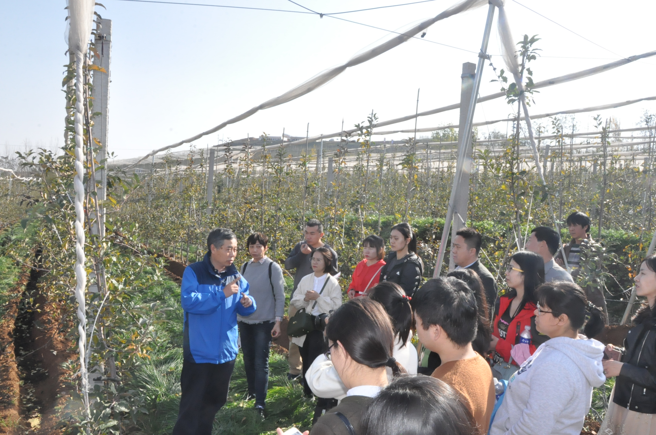 全体教师赴洛宁上戈海升现代苹果矮化密植示范园集体备课,现场观摩苹果矮砧集约高效栽培模式。