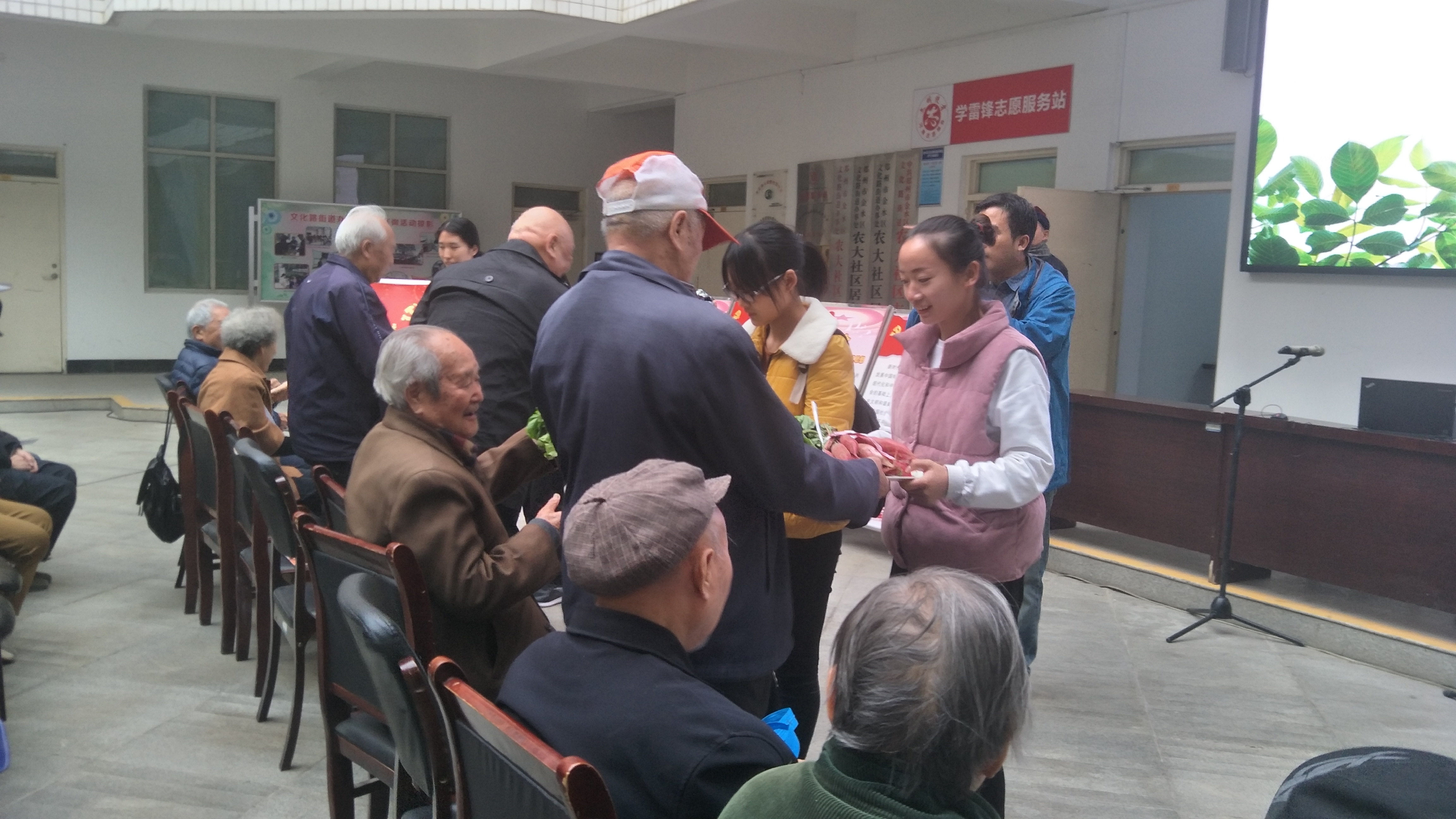 11月10日下午,我院于第一生活区开展“学十九大精神、话成长成才”蔬菜义送活动。院党委组织员黄婉珺带领党员农场部分成员来到农大一区,给老教师们和党员们赠送刚从三区农场摘取的有机蔬菜,并同老党员们一同聆听了马克思主义学院陈娱院长对十九大的解读报告,认真学习了习总书记在报告中的重要内容。