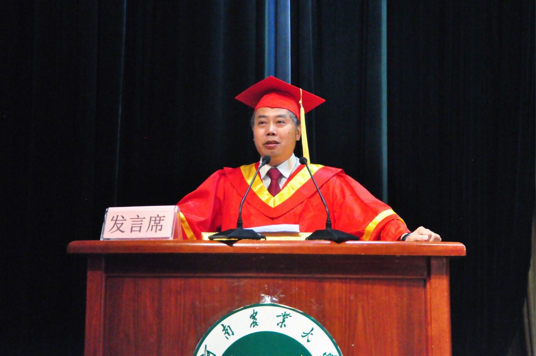 94届蔬菜系毕业生原玉香上台发言。原老师饱含深情地对母校表达了感激与热爱,她以自身经历为例对台下毕业生做出鼓励,用诙谐幽默的语言与台下学子亲切互动。