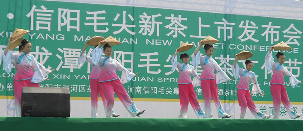 茶学专业2012级胡慧等8位学生以优美的舞姿拉开了发布会的序幕,她们表演的《茶山情歌》舞蹈,使整个会场洋溢着采茶的热闹气氛。此次新茶发布会由龙潭茶叶公司举办,董事长陈世强发表了热情洋溢的讲话,参会的还有河南省总商会会长梁静等众多嘉宾,信阳毛尖手工炒制非物质文化遗产传承人、国家级制茶大师周祖峰做了现场炒茶演示,会场展示了一系列环保材料包装的新毛尖茶品和爱茶人设计的精美茶席,以及现场品茶等茶事活动,使在场的每一位观众都得到了茶香熏陶和茶文化的浸润。