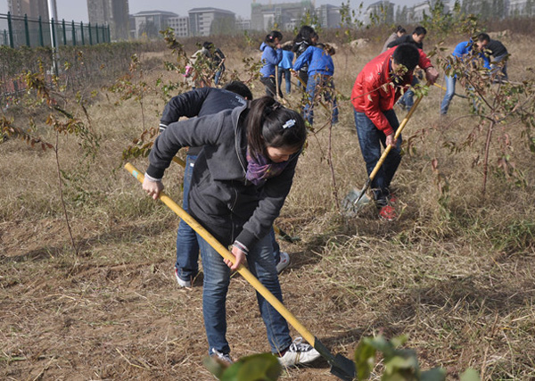 早上8点半,60余名学生党员在院党委书记耿超明、果树系主任陈延惠、院团委书记李坤、院团委副书记郭武轲的带领下,前往新校区。一到“百果林”,党员们便跃跃欲试,按照支部分成十个小组,立即投入到热火朝天的劳动中去。劳动过程中,许多女同学巾帼不让须眉,娴熟地完成除草、清理等环节, 当日狂风肆虐,却无法吹散同学们的热情和干劲儿。经过三个多小时的努力,大面积的杂草被党员们纷纷“围剿”,“百果林”四周的环境更加整洁。