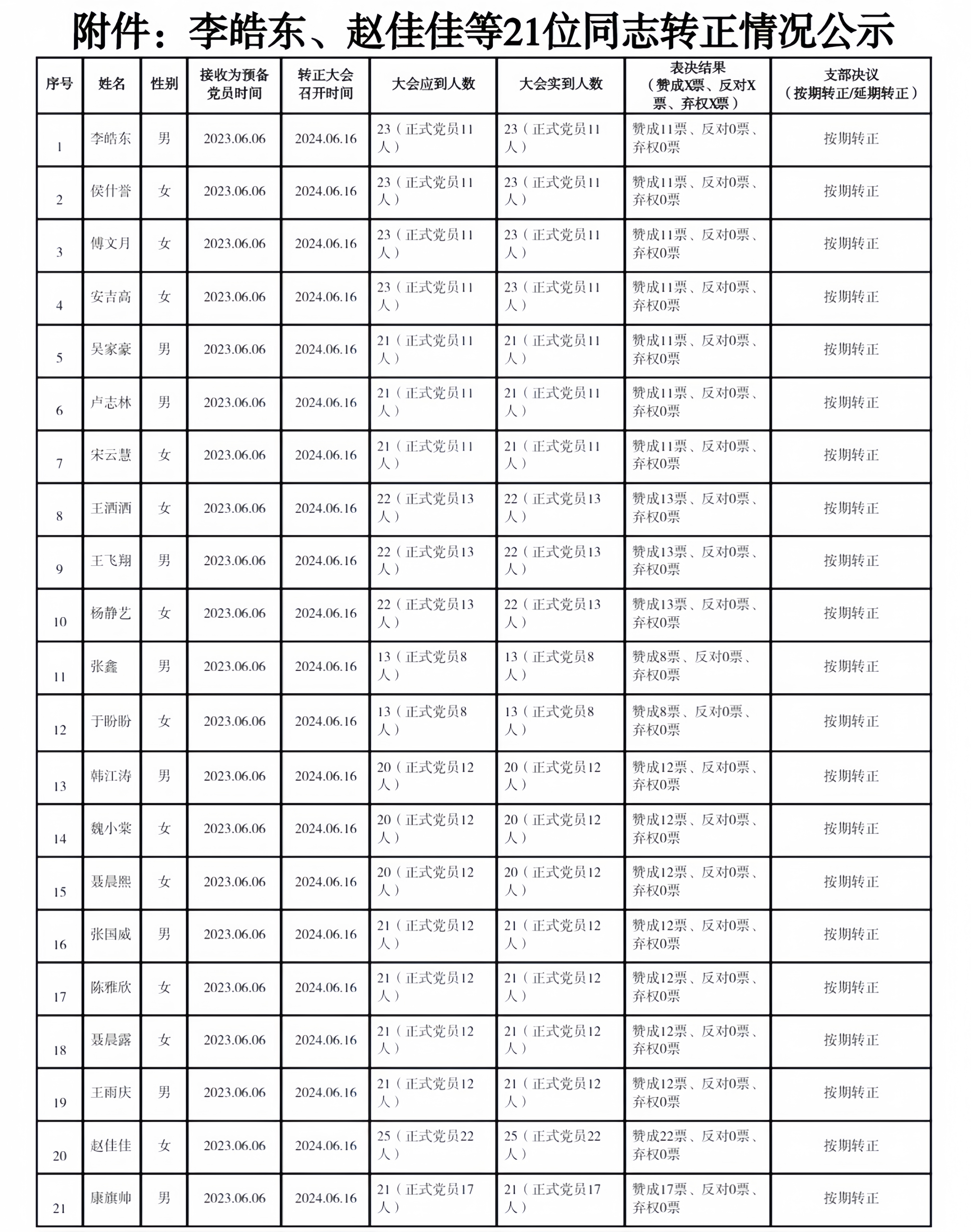为进一步增强发展党员工作的透明度,严格发展党员工作程序,根据《中国共产党章程》和《中国共产党发展党员工作细则》,现将李皓东、赵佳佳等21名预备党员转正情况予以公示。