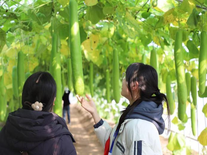 随后,新生们移步至室外的瓜菜展示区与露天大田区,他们近距离观察番茄的挂果形态、触摸辣椒的质感、了解西瓜的培育技术,脸上洋溢着好奇与兴奋。在田间地头,专业人士结合自身实践经验耐心解答新生们的疑问,让新生们感受到育种创新为农业生产带来的变革。
