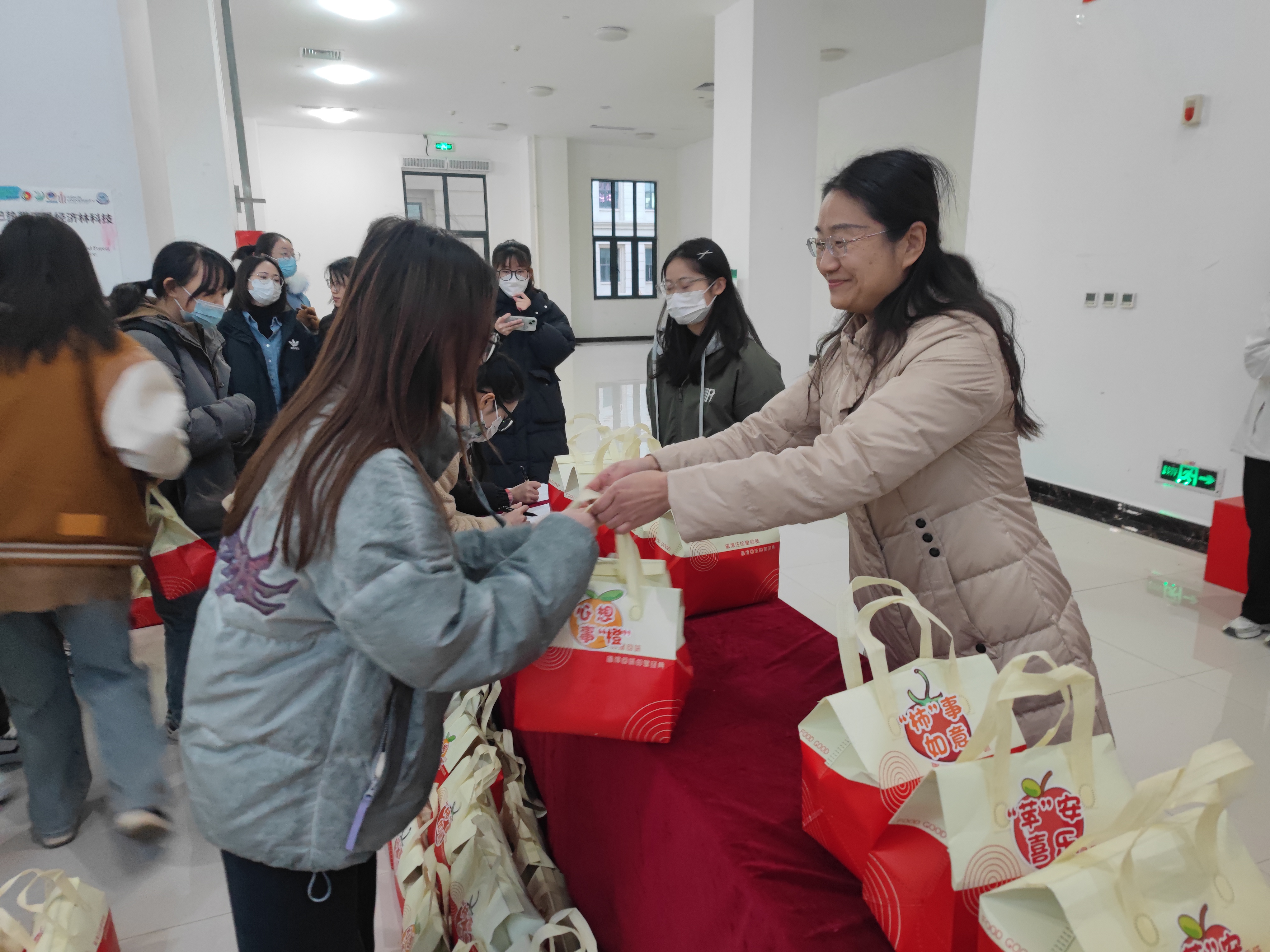 接着,院领导和辅导员为考研学子分发学院准备的“考研暖心礼包”,寄托着学院对考研学子们的亲切关怀和祝福。苹果象征着“苹”安喜乐,橙子代表着心想事“橙”,西红柿代表着“柿”事如意,美好的祝福希望给同学们带来更好的运气。