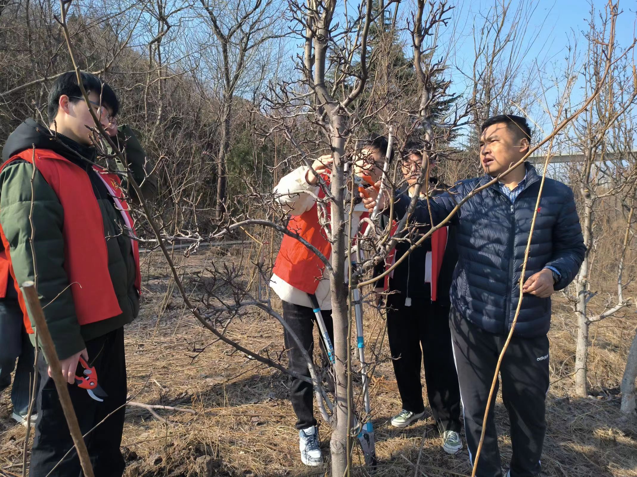 志愿者们在白团辉老师的指导下,秉着“因树修剪,随枝造型”的理念,利落地剪掉直立枝,去除冗杂的小枝,为果树打开光路,形成“南疏北密,上疏下密”的合理树形,为来年果实的生长扫清障碍。一上午的劳动,大家在活动中既锻炼了能力,也丰富了实践经验。
