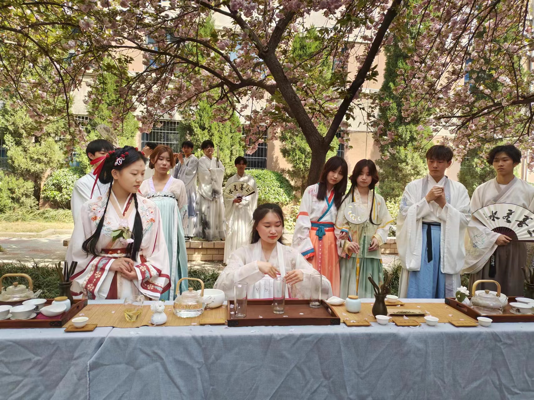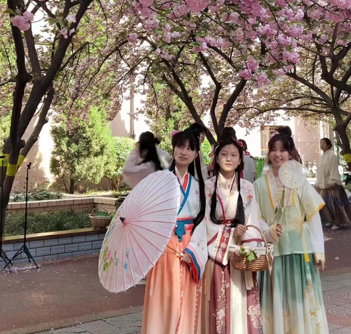 春光烂漫,樱花绚丽,色漫天堂 “樱花文化节”就在这灿烂的阳光下拉开了序幕。活动开始,由艺术团舞蹈组表演舞蹈《长街万巷》,数位同学身着汉服在樱花小道上翩翩起舞,她们曼妙的舞姿和在空中飞扬的樱花构成了一副美好的画卷。随后,艺术团礼仪组的成员们进行了一场精彩的汉服走秀,她们有的手持团扇、有的手执书卷、有的腰佩长剑,共同在樱花小道展示属于汉服独特的风采。紧接着,李涵钰同学进行了小提琴的演奏,曲调优美,宛转悠扬;茶轩社的成员们向大家展示和讲解了茶艺,之后同学们开始品茶香,食茶点。最后,伴随着悠扬的古筝,大家一起在樱林赏樱花,互相拍照留念。