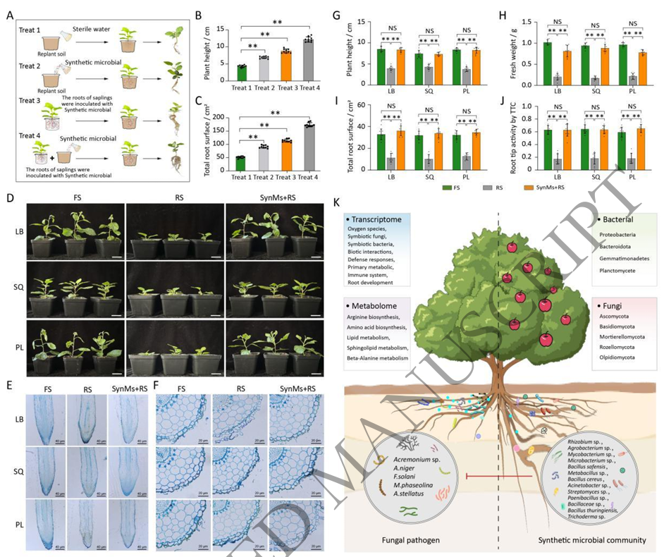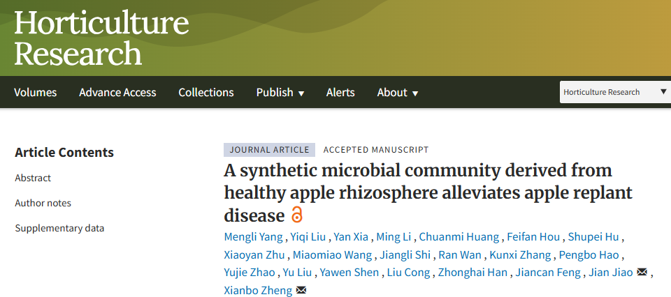 苹果逆境生物学与简约技术栽培体系团队郑先波教授、焦健教授在Horticulture Research(中科院一区,影响因子8.5)发表研究论文“A synthetic microbial community derived from healthy apple rhizosphere alleviates apple replant disease”,系统阐明了苹果再植病的微生物驱动机制,并提出以合成微生物群落(synthetic microbial community, SynMs)缓解苹果再植病的新模式。