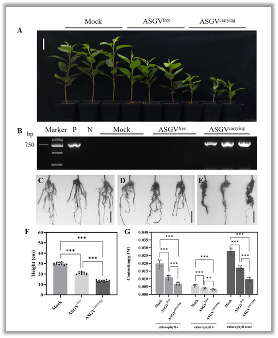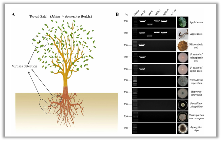 面对这一产业难题,团队另辟蹊径,将研究视角从地上转向地下,深入探究土壤微生物与病毒传播的潜在联系。通过高通量测序、真菌分离纯化、传毒生物学测定等一系列现代生物技术手段,成功从患病苹果树根际土壤中分离到携带ASGV的腐皮镰刀菌,并通过温室接种试验,证实了该真菌能够将病毒成功传播到健康的苹果实生苗上,引起典型症状。