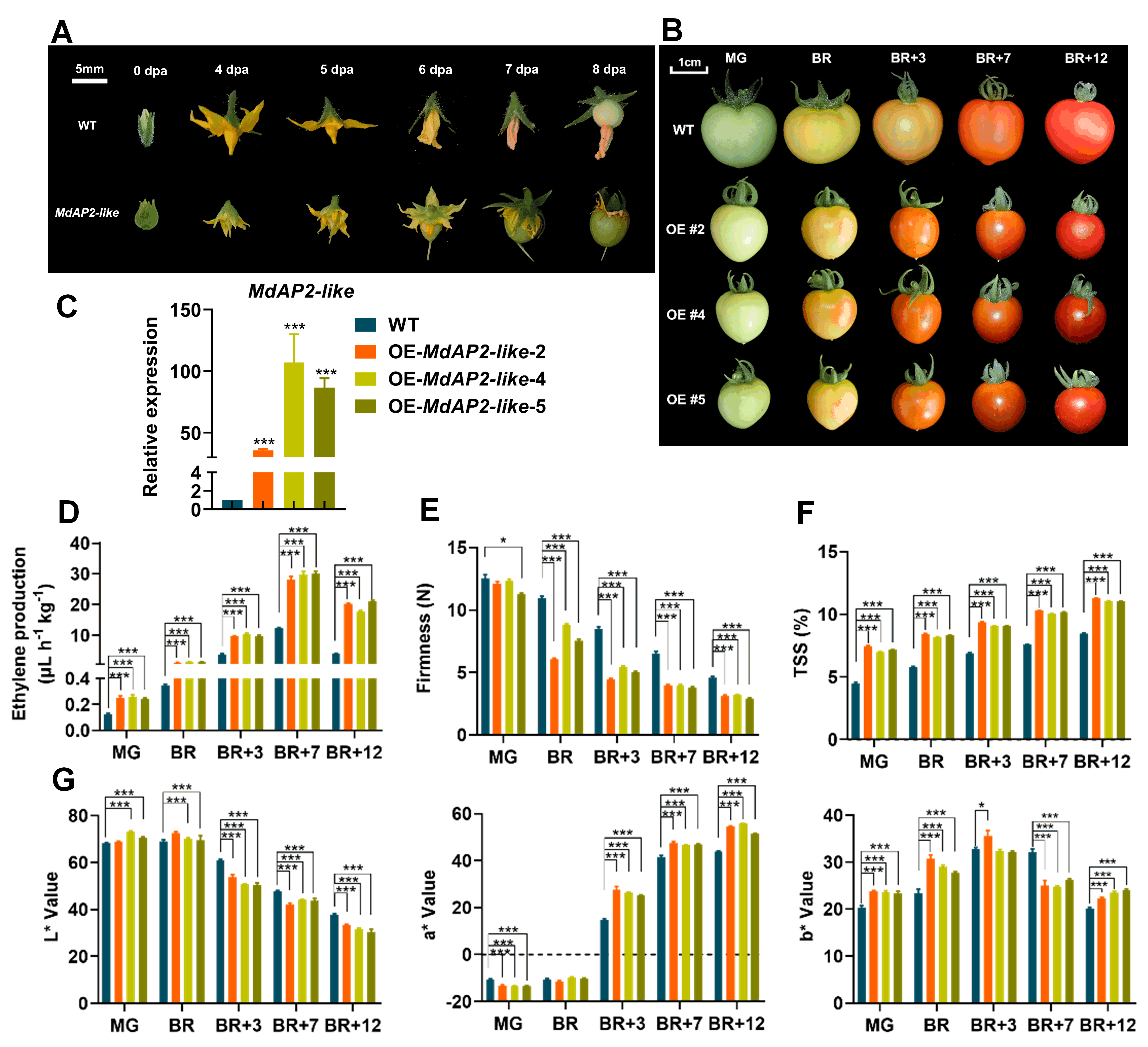 图2. 过表达MdAP2-like促进了番茄果实的成熟软化和减小了果实大小