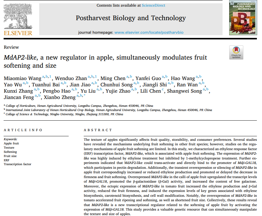 苹果创新研究团队在Postharvest Biology and Technology期刊上发表了题为“MdAP2-like, a new regulator in apple, simultaneously modulates fruit softening and size”的研究论文,揭示了调控苹果果实软化和果实大小的分子机制。