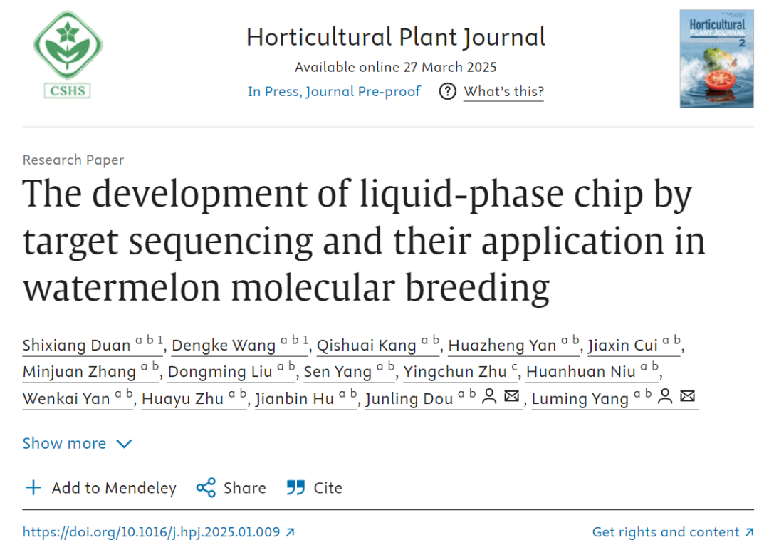 作物基因组与生物技术育种科技创新团队在Horticultural Plant Journal(中科院1区Top,IF=5.7)发表了题为“The development of liquid-phase chip by target sequencing and their application in watermelon molecular breeding ”的研究论文。本研究成功开发了两款不同标记密度的西瓜SNP液相芯片,作为西瓜物种中首次研发的液相芯片技术平台,为西瓜种质资源提供了低成本、高通量的基因分型解决方案,可广泛应用于群体遗传结构解析、基因精细定位、种子纯度鉴定等多种研究场景。此外,该技术在西瓜分子标记辅助育种中的成功应用,显著降低了人工成本,大幅提升了育种效率,为西瓜分子育种提供了创新性技术工具和方法体系,同时也为其他园艺作物的分子育种研究提供了重要的技术借鉴和理论参考。