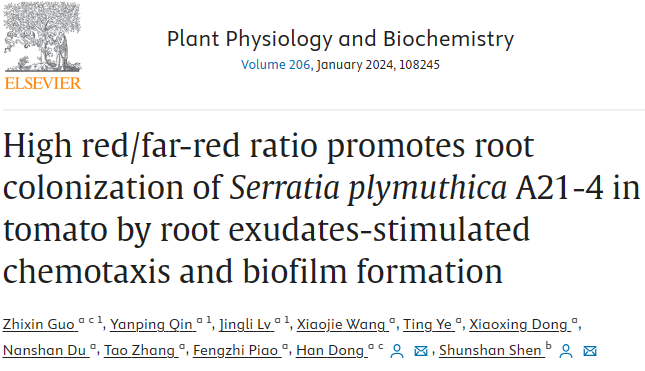 文章链接:High red/far-red ratio promotes root colonization of Serratia plymuthica A21-4 in tomato by root exudates-stimulated chemotaxis and biofilm formation - ScienceDirect