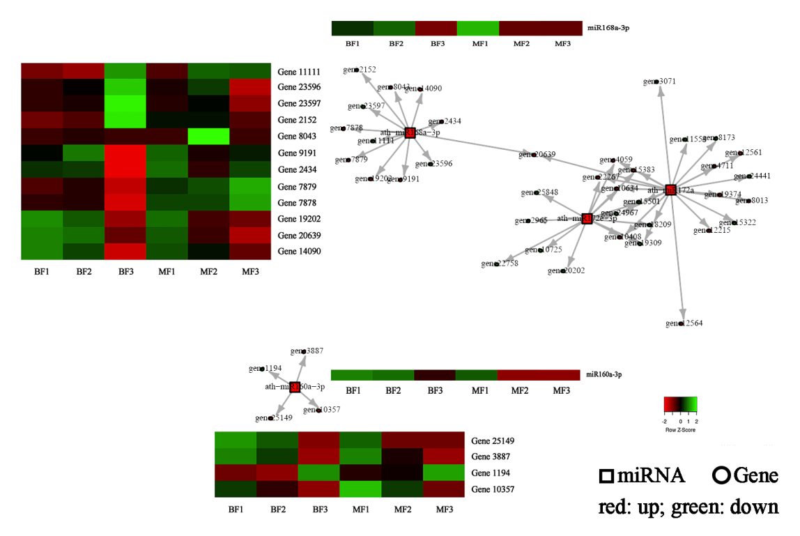 研究通过对石榴完全花和不完全花的三个发育阶段的miRNA测序及分析发现,保守miR156、miR157、miR159、miR160、miR164、miR165、miR166、miR167、miR169、miR172和Novel 41、Novel 95、Novel 111、Novel 178、Novel 312、Novel 391、Novel 437、Novel 472在石榴胚珠发育过程中差异表达。差异表达miRNAs的靶基因预测、功能富集分析、表达趋势和关联分析等结果表明,石榴新鉴定的Novel 41、Novel 95、Novel 111、Novel 178和保守miR160、miR164及miR172是参与石榴胚珠发育过程的重要调控因子。