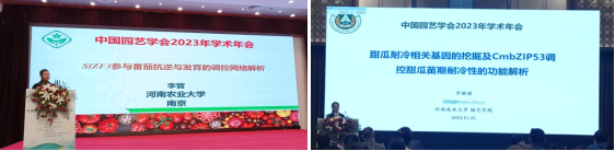 SlZF3参与番茄抗逆与发育的调控网络解析”和“甜瓜耐冷相关基因的挖掘及CmbZIP53调控甜瓜苗期耐冷性的功能解析”的学术报告,并就报告内容与有关专家学者进行交流。一些参会专家对两位老师的报告给予了高度评价,并提出了有建设性的建议,李营和李丽丽两位老师均表示通过本次学术交流自己收获颇多。