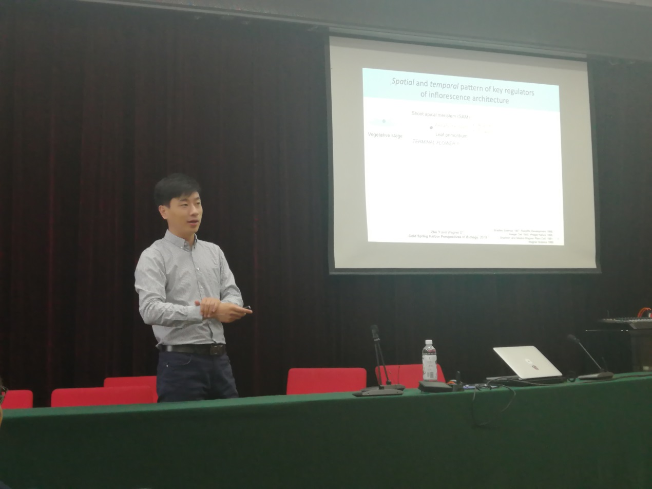 朱杨教授在报告中首先介绍了植物株型特殊的生物、生态和农业的意义,指出研究茎尖分生组织如何根据内部发育信号和外部环境决定花序发育方向是影响株型建成的关键科学问题。随后又介绍了自己博士及博士后期间的研究结果:高等植物成花素家族基因