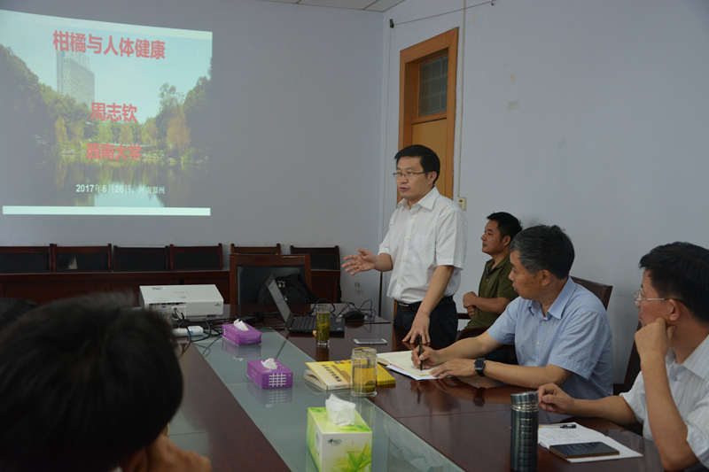 如同到家一般,自然大方,极具学者风范。周教授报告内容丰富,包括柑桔的营养和活性成分;柑桔与人体健康的研究;柑桔果品的科学利用和柑桔果品与运动营养和保健等等。周教授先简略而生动讲述了柑桔历史,而后详细解说对柑桔果品营养学的研究,包括柑桔的抗氧化作用、抗衰老作用和与人体疾病防御等。周教授讲授方式幽默,报告内容深入浅出,即讲出了科学研究的精髓,又便于学生理解,整个过程掌声不断。