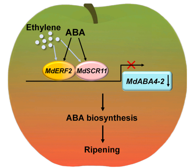 MdABA4-2的表达显著下调,ABA含量显著升高。该研究揭示了MdERF2-MdSCR11模块通过调控ABA合成调控苹果果实成熟的分子机制(Fig.4),不仅为乙烯和脱落酸在调控跃变型果实成熟中的互作机制提供了新的理论依据,也为今后通过分子育种和采后调控技术延缓苹果成熟衰老、提升果实商品价值提供了重要参考。