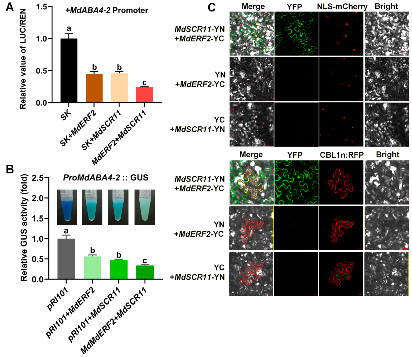 Fig. 3. MdERF2 and MdSCR11 synergistically regulate MdABA4–2 promoter activity.