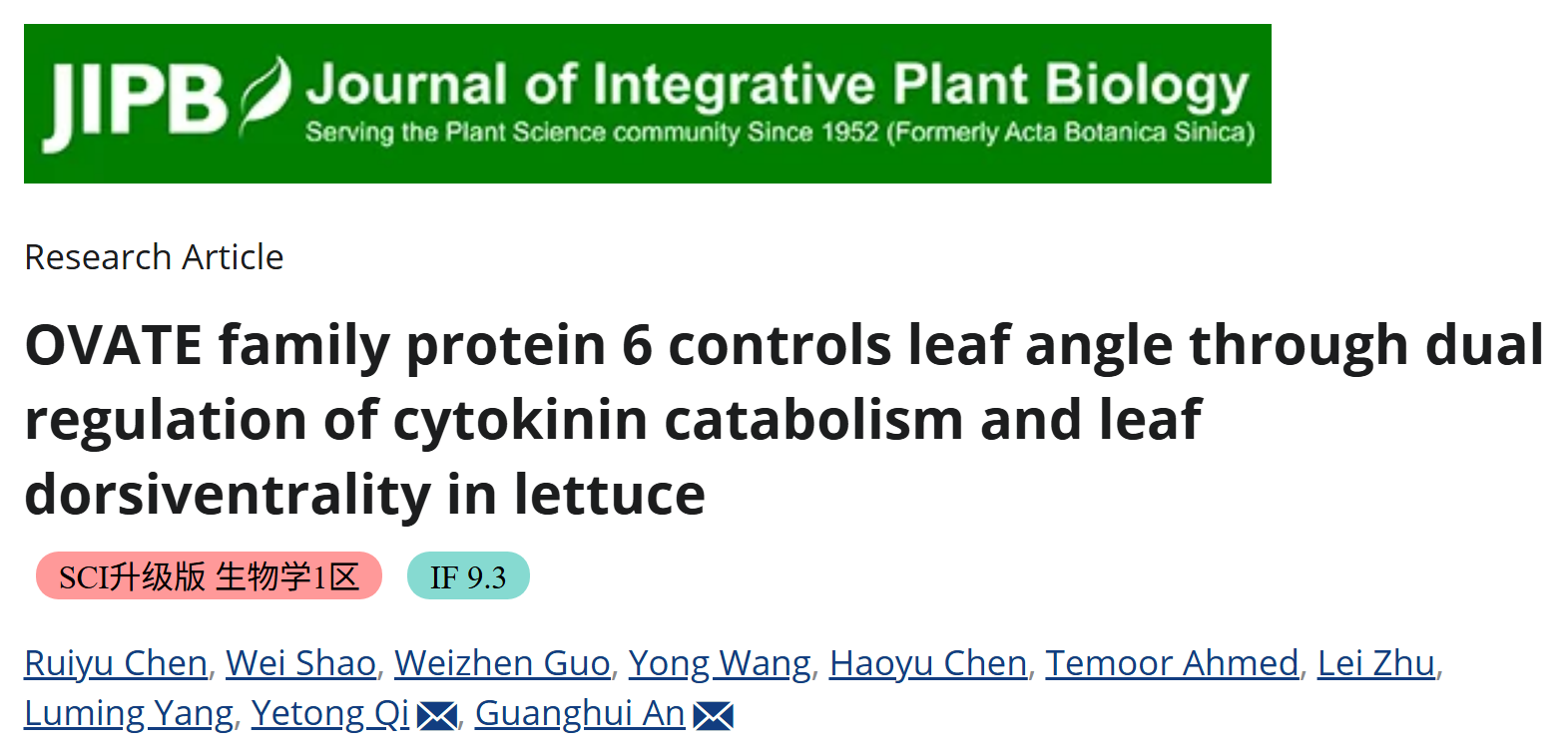安光辉教授团队,在《Journal of Integrative Plant Biology》(中科院一区Top)发表重要成果,首次揭示了OVATE家族蛋白LsOFP6a通过细胞分裂素代谢与叶背腹性精准调控生菜叶夹角的分子机理,为培育高密度适配型生菜品种提供了全新遗传靶点。