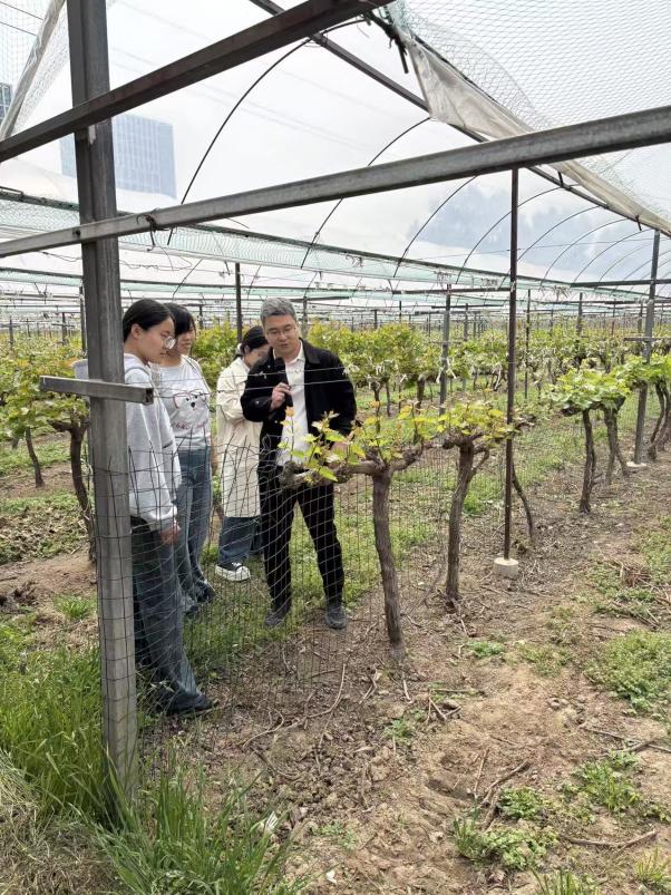 随后,实践团队前往郑果所 国家级果树 种质资源 圃 开展实地学习。 资源圃内 种植着桃、葡萄等多种果树,其中桃种质资源保存量居世界第一,宛如一座“果树资源宝库”。基地老师结合田间植株,向同学们系统讲解了果树种质资源的收集、保存、鉴定与利用等核心知识,介绍了科研人员通过杂交育种等技术改良果树品种、提升品种抗逆性的实践路径,让同学们对果树科研的实际应用有了更为直观的认知。